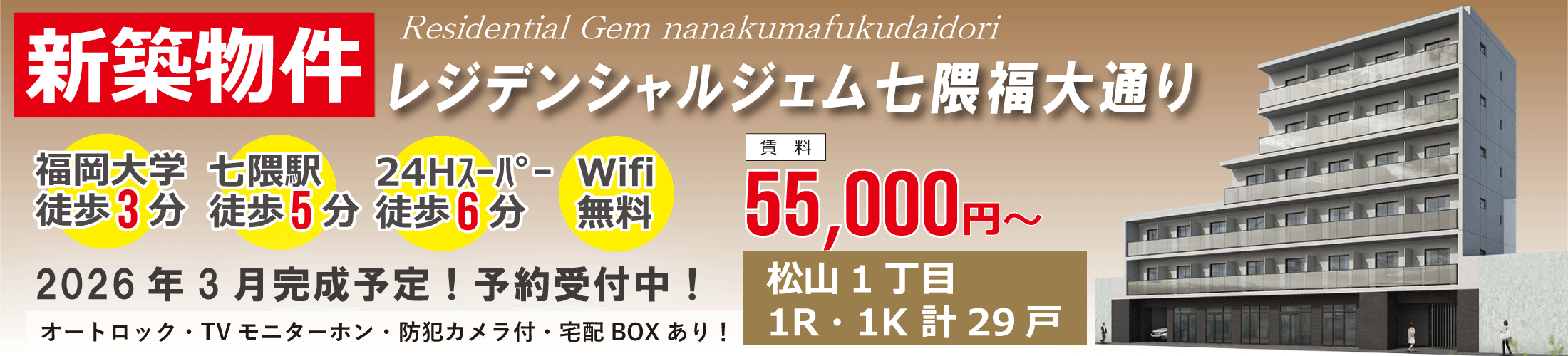 おしらせ 2025.11.22 【合格前予約】指定校推薦・学校推薦型選抜の受験の皆様へ 2025.09.29 2026年春入居予約受付中! 2025.09.11 即入居可!!【グランデュオール松山:脱衣所有タイプ】 2025.07.12 【新築物件】レジデンシャルジェム七隈福大通り 2025.07.01 人気物件に空きがでました!!【アンリシール佳】【リアライズビル】 新着物件情報 2025年11月13日 【新築物件】2026年3月完成予定!予約受付中!レジデンシャルジェム七隈福大通り ジャンル別特集 福岡大学生専用物件 鉄筋マンション特集 初期費用ラクラク物件 女性専用物件 3万円以下お手頃物件 2DK以上 売買物件 貸店舗 月極駐車場 オススメ物件 5.0万円以上 七隈エリア 福岡大学生専用物件 プリマベーラ401号【福岡大学生専用物件】 2.5万円~3.0万円 2.5万円以下 七隈エリア 敷金・礼金ゼロ 福岡大学生専用物件 井手口コーポ4号タイプ【福岡大学生専用物件】 2.5万円以下 初期費用ラクラク入居物件 敷金・礼金ゼロ 片江・神松寺エリア 福岡大学生専用物件 ハイツ竹林B棟【福岡大学生・関係者専用物件】 3.5万円~4.0万円 4.0万円~4.5万円 七隈エリア 福岡大学生専用物件 コウジイコート1号タイプ【福岡大学生専用物件】 3.5万円~4.0万円 七隈エリア 福岡大学生専用物件 ベルソーナ七隈1号タイプ【福岡大学生専用物件】 3.5万円~4.0万円 七隈エリア 福岡大学生専用物件 ベルソーナ七隈2~5号タイプ【福岡大学生専用物件】 2.5万円~3.0万円 3.0万円~3.5万円 3.5万円~4.0万円 七隈エリア 福岡大学生専用物件 ジョイナスパートII1号タイプ【福岡大学生専用物件】 3.5万円~4.0万円 4.0万円~4.5万円 七隈エリア 福岡大学生専用物件 ジョイナスパートII2〜5号タイプ【福岡大学生専用物件... 2.5万円~3.0万円 2.5万円以下 七隈エリア 初期費用ラクラク入居物件 敷金・礼金ゼロ 松山エリア 福岡大学生専用物件 山内コーポ1【福岡大学生専用物件】 2.5万円~3.0万円 七隈エリア 初期費用ラクラク入居物件 敷金・礼金ゼロ 福岡大学生専用物件 山内コーポ2【福岡大学生専用物件】 2.5万円以下 初期費用ラクラク入居物件 南片江エリア 敷金・礼金ゼロ 福岡大学生専用物件 IDパークハイツ 2.5万円~3.0万円 3.0万円~3.5万円 敷金・礼金ゼロ 福岡大学生専用物件 井手口コーポ1~3号タイプ【福岡大学生専用物件】 2.5万円~3.0万円 3.0万円~3.5万円 女性専用物件 松山エリア 福岡大学生専用物件 メルローズ松山【福岡大学生専用物件】 3.5万円~4.0万円 4.0万円~4.5万円 七隈エリア 女性専用物件 福岡大学生専用物件 エスペランサVI【福岡大学生専用物件】 2.5万円~3.0万円 3.0万円~3.5万円 3.5万円~4.0万円 七隈エリア 敷金・礼金ゼロ 福岡大学生専用物件 ウイングTY【福岡大学生専用物件】 4.0万円~4.5万円 4.5万円~5.0万円 七隈エリア 福岡大学生専用物件 エルカーサ七隈【福岡大学生専用物件】 4.0万円~4.5万円 4.5万円~5.0万円 七隈エリア 女性専用物件 福岡大学生専用物件 エルマール城南【福岡大学生専用物件】 3.5万円~4.0万円 福岡大学生専用物件 西片江・梅林エリア カレッジヒルズ【福岡大学生専用物件】 4.5万円~5.0万円 5.0万円以上 七隈エリア 福岡大学生専用物件 プリマベーラ1LDKタイプ【福岡大学生専用物件】 4.0万円~4.5万円 4.5万円~5.0万円 松山エリア 福岡大学生専用物件 グランデュオール松山【福岡大学生専用物件】 4.5万円~5.0万円 松山エリア 福岡大学生専用物件 グランデュオール松山1号室タイプ【福岡大学生専用物件】 4.5万円~5.0万円 松山エリア 福岡大学生専用物件 グランデュオール松山脱衣所有タイプ【福岡大学生専用物件... 2.5万円~3.0万円 3.0万円~3.5万円 七隈エリア 敷金・礼金ゼロ 福岡大学生専用物件 シャトレ城南【福岡大学生専用物件】 3.5万円~4.0万円 4.0万円~4.5万円 七隈エリア 福岡大学生専用物件 コウジイコート2〜5号【福岡大学生専用物件】 2.5万円~3.0万円 3.0万円~3.5万円 七隈エリア 敷金・礼金ゼロ 福岡大学生専用物件 コーポサンセブン1号タイプ【福岡大学生専用物件】 3.0万円~3.5万円 3.5万円~4.0万円 七隈エリア 敷金・礼金ゼロ 福岡大学生専用物件 コーポツドイ【福岡大学生専用物件】 2.5万円~3.0万円 3.0万円~3.5万円 七隈エリア 敷金・礼金ゼロ 福岡大学生専用物件 コーポサンセブン2.3号タイプ【福岡大学生専用物件】 4.5万円~5.0万円 女性専用物件 松山エリア 福岡大学生専用物件 デュオユーフォリア【福岡大学生専用物件】 2.5万円~3.0万円 2.5万円以下 七隈エリア 初期費用ラクラク入居物件 敷金・礼金ゼロ 福岡大学生専用物件 サンコーポ中村【1Kタイプ】 2.5万円~3.0万円 2.5万円以下 初期費用ラクラク入居物件 敷金・礼金ゼロ 福岡大学生専用物件 西片江・梅林エリア サンハウス黒木【福岡大学生専用物件】 4.5万円~5.0万円 七隈エリア ブルーム七隈 4.0万円~4.5万円 4.5万円~5.0万円 七隈エリア 福岡大学生専用物件 エルカーサ七隈【福岡大学生専用物件】 4.0万円~4.5万円 4.5万円~5.0万円 七隈エリア 女性専用物件 福岡大学生専用物件 エルマール城南【福岡大学生専用物件】 4.5万円~5.0万円 5.0万円以上 七隈エリア 福岡大学生専用物件 プリマベーラ